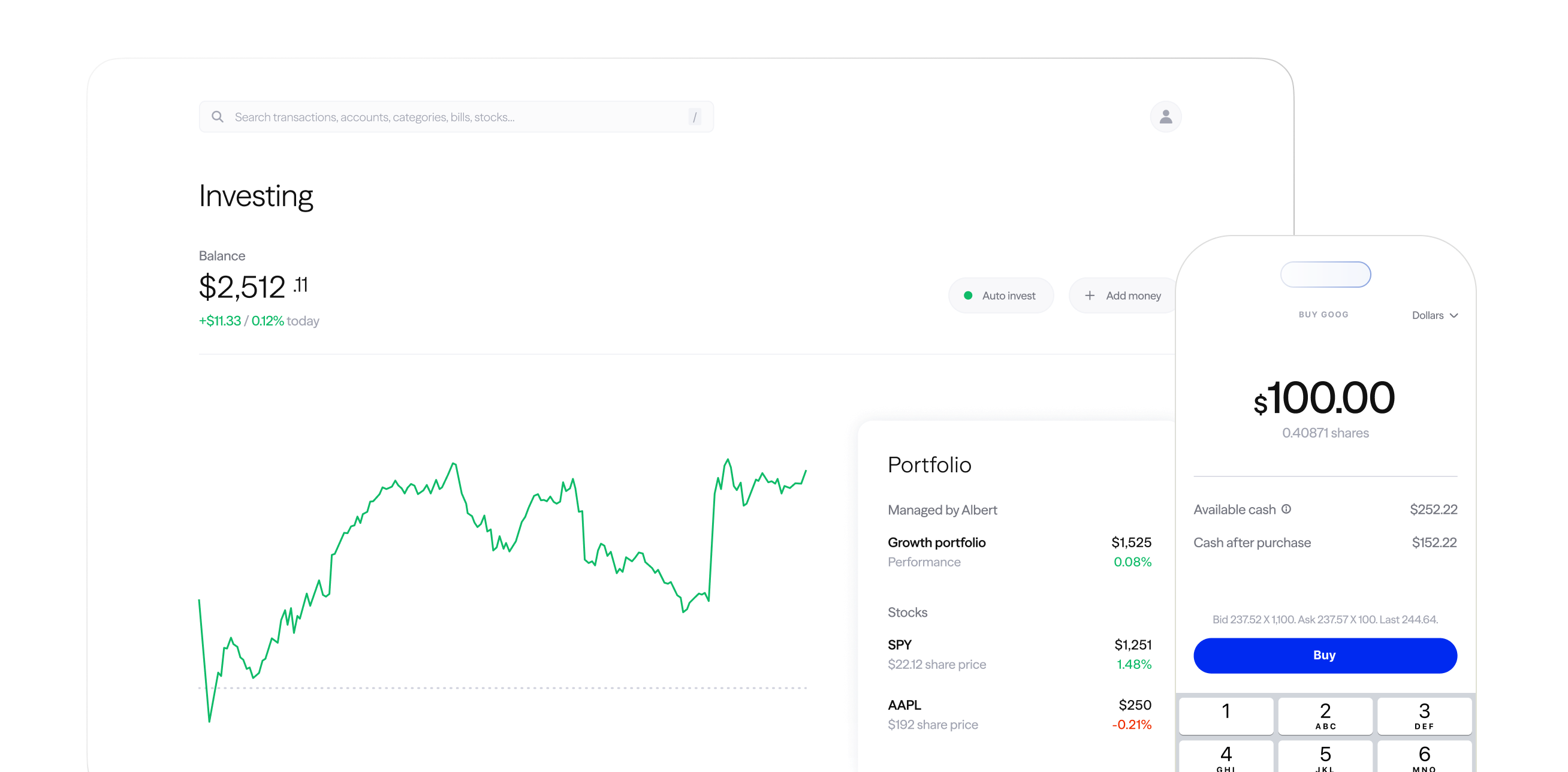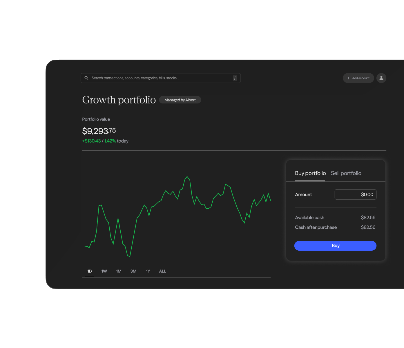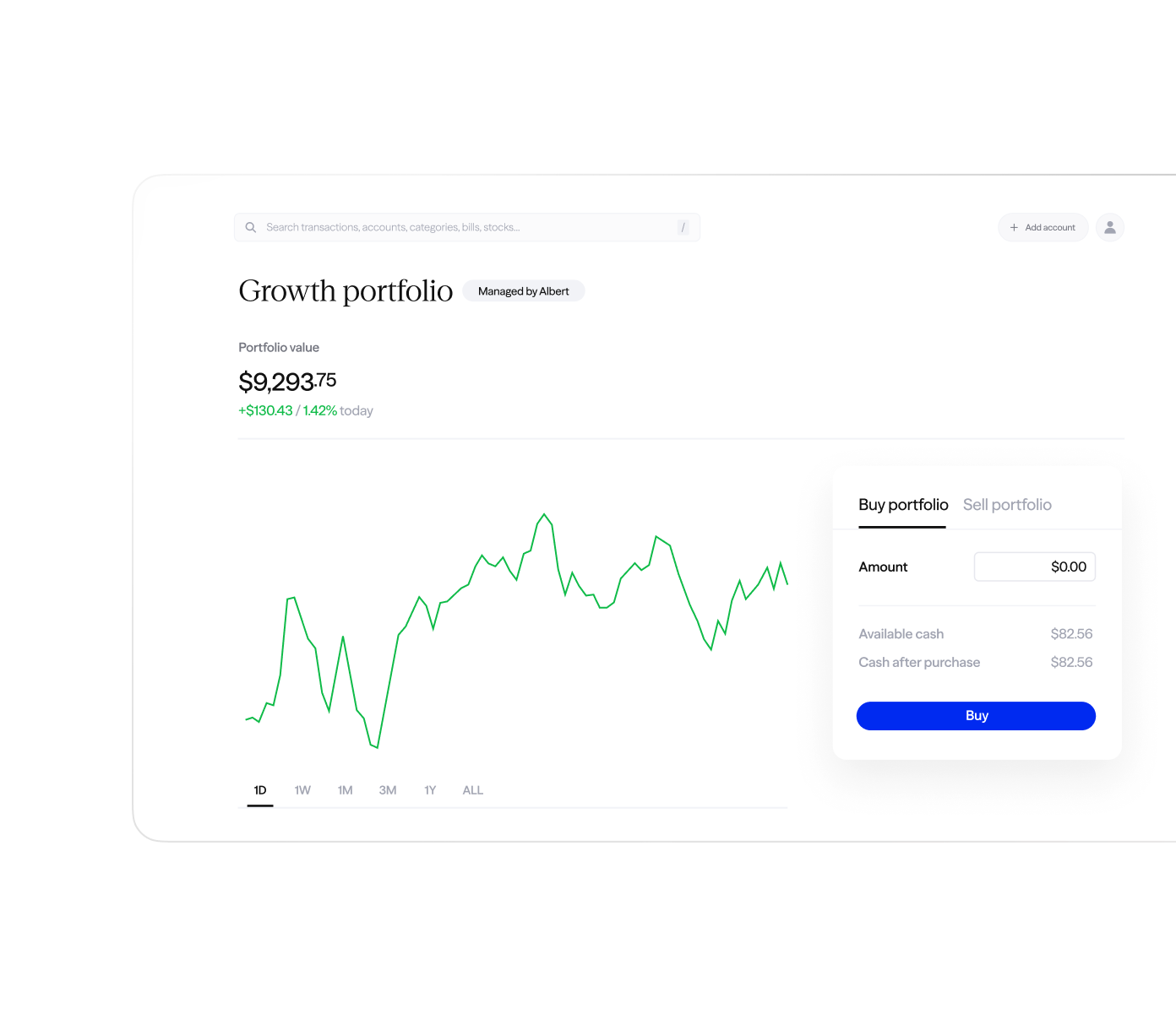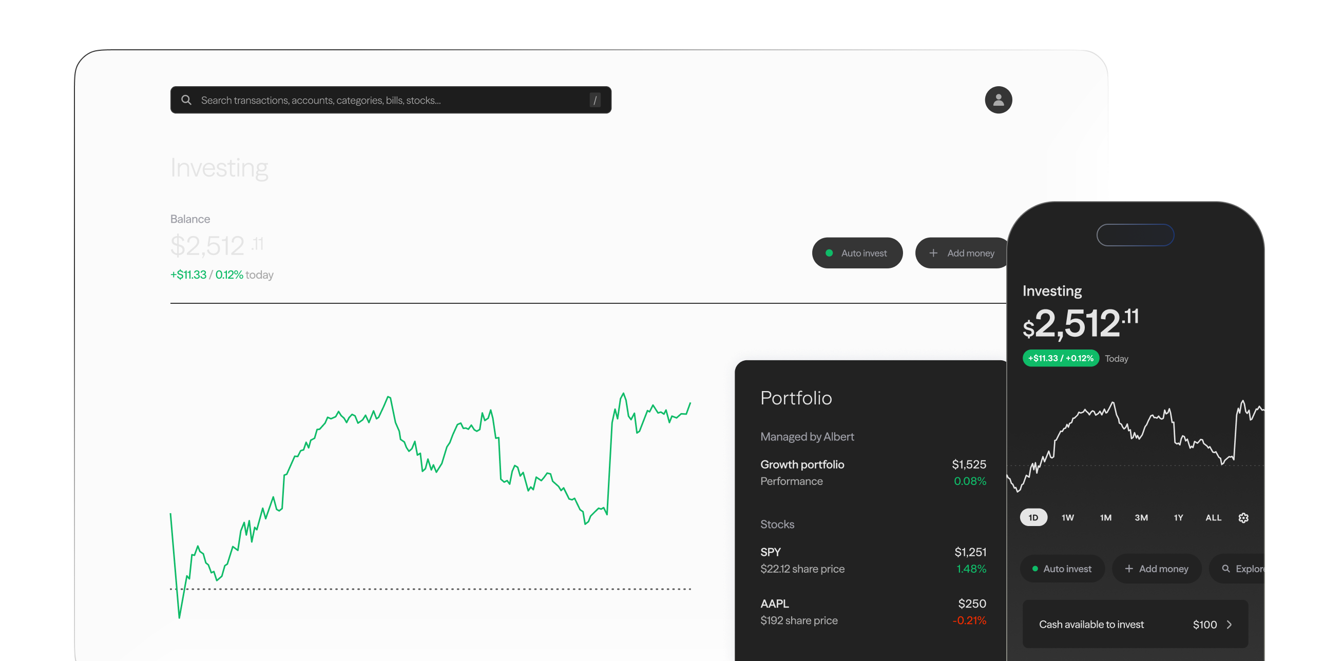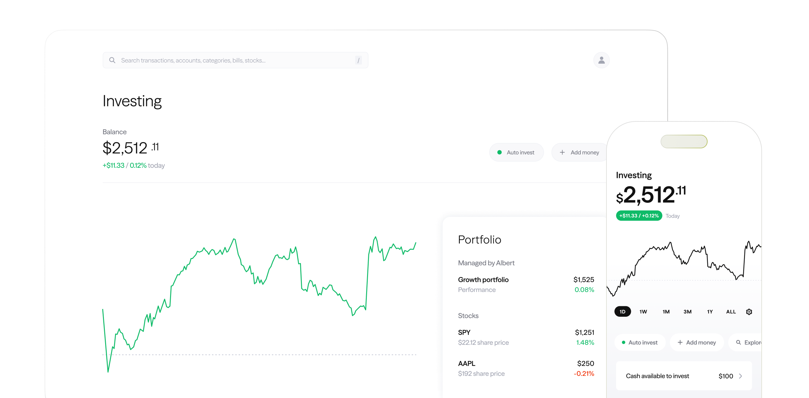 Invest in stocks, ETFs, and portfolios managed by Albert. Auto invest with Smart money or make your own trades.
