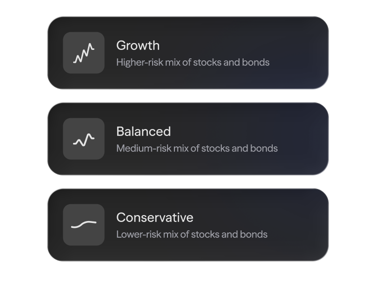 Choose from portfolios designed for core risk levels, Growth, Balanced, and Conservative.