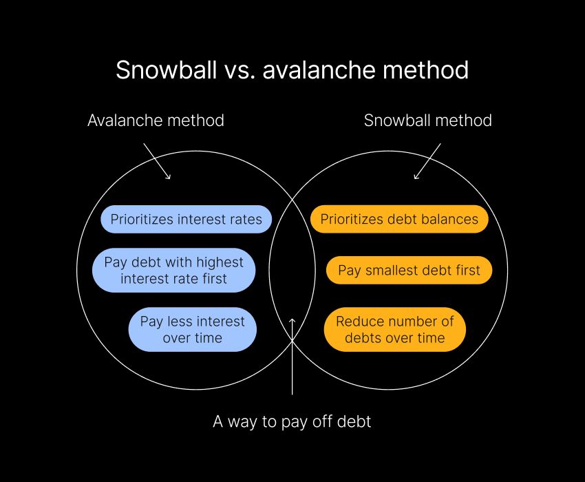 Avalanche method: Focuses on paying off debts with the highest interest rates first, helping you save money on interest and pay off debt more efficiently.